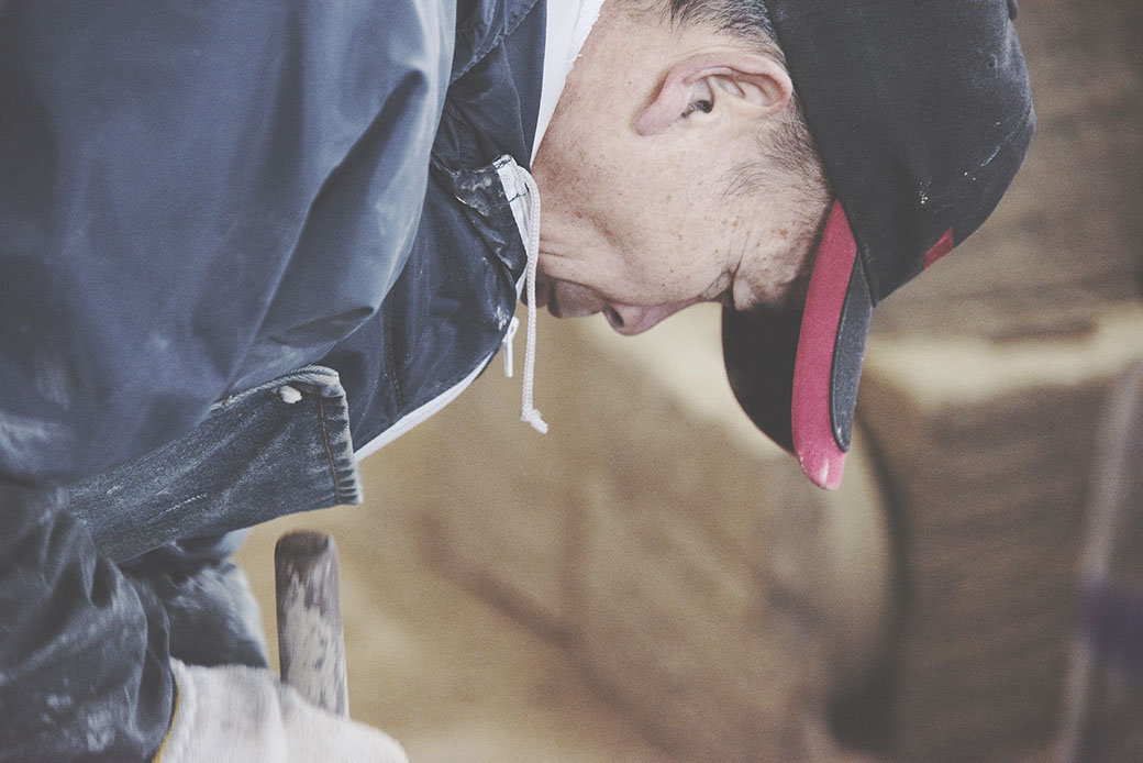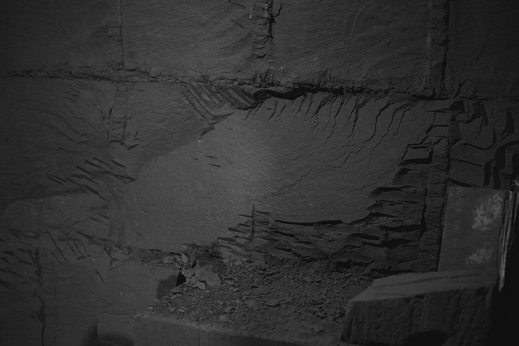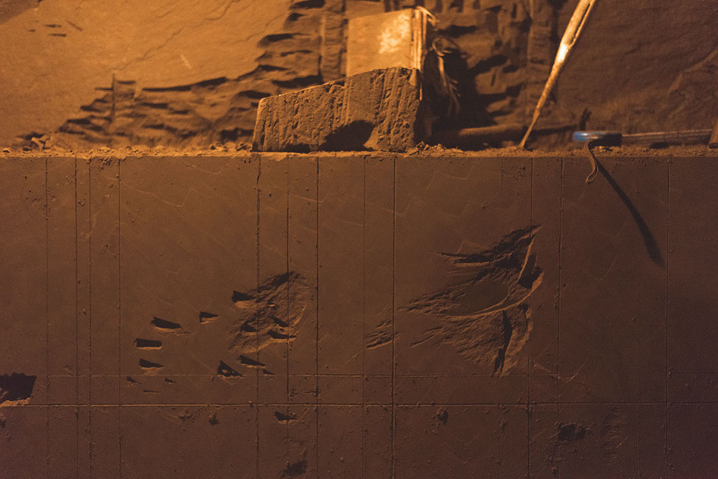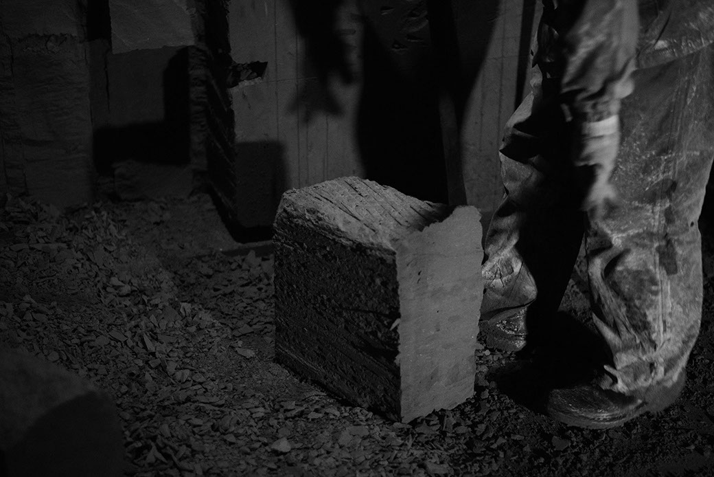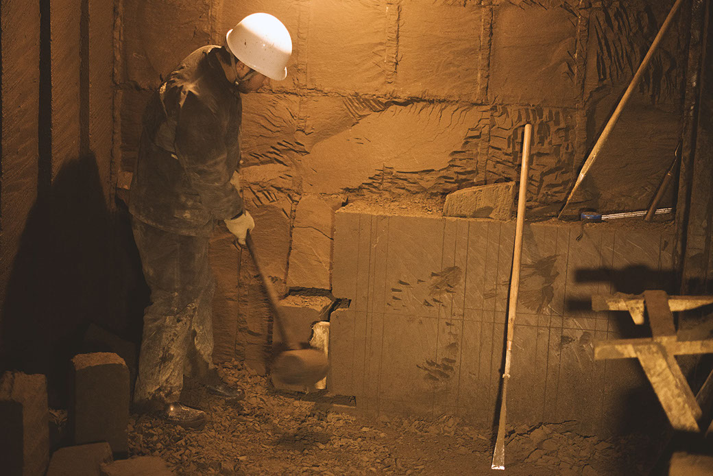 切り出し職人の仕事は、毎朝ノミを持ち数百メートル奥深く続く坑道へと向かうところから始まる。岩肌から染み出した水でぬかるんだ坑道内は、全長数キロにも及び地中深く迷路のように枝分かれして掘られている。