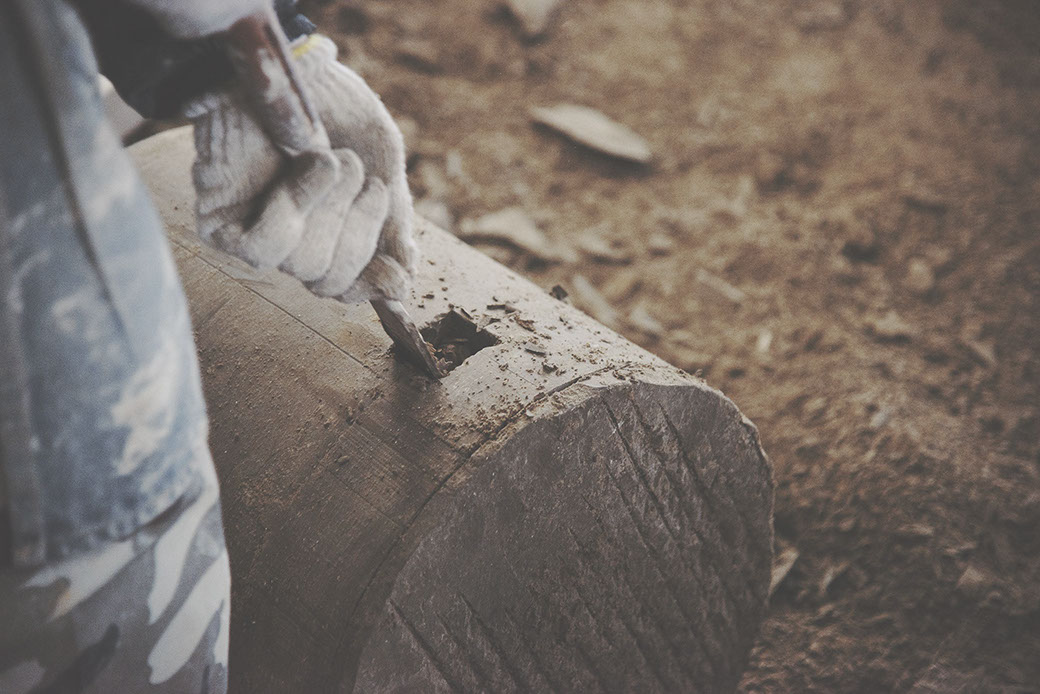 坑道から切り出された珪藻土の塊は、まだ水分が残った柔らかいうちに七輪の形に成形していく。代表的な角型七輪を成形する際は、初めに平ノミにより外形を「まなぐ」。まなぐというのは、外形を平らに整える基本的な削りの技術で、この技術は長年継承されてきたもの。一つ間違えば、苦労して切り出した珪藻土の塊を一瞬にして無駄にしてしまうような繊細な作業だが、職人はなんの迷いもなく数ミリの精度で削っていく。外側の削り作業が終わると、七輪の内側の部分も丁寧に削られていく。