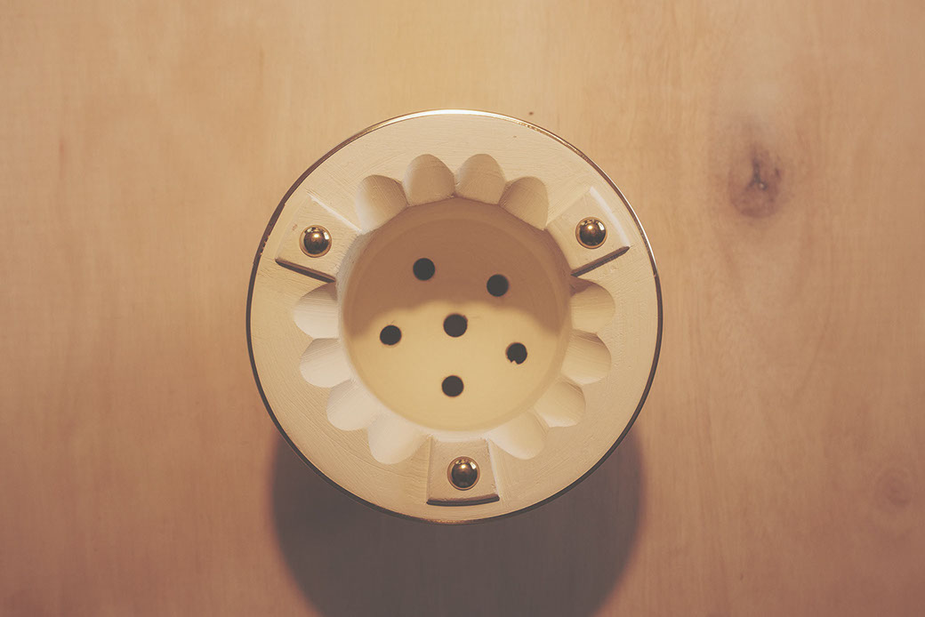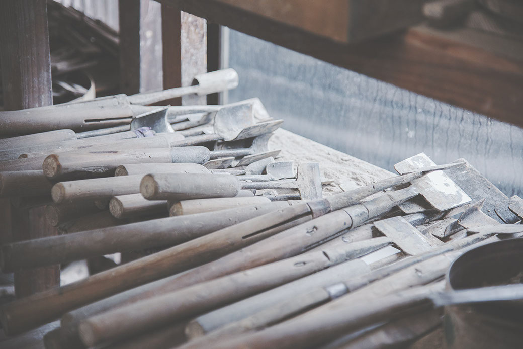 奥行き数百メートルの坑道の奥で、珪藻土の壁を七輪のサイズに合わせて切り込みを入れて、”打ち剥がして”いきます。端がした固まりを、まだ水分が残る柔らかいうちに製品サイズに削り、成形してきます。この成形作業は様々なかんなを使い分け、手作業で職人が行います。最後に釜で焼成して、着色や金具を取る着ける行程を経てようやく完成します。